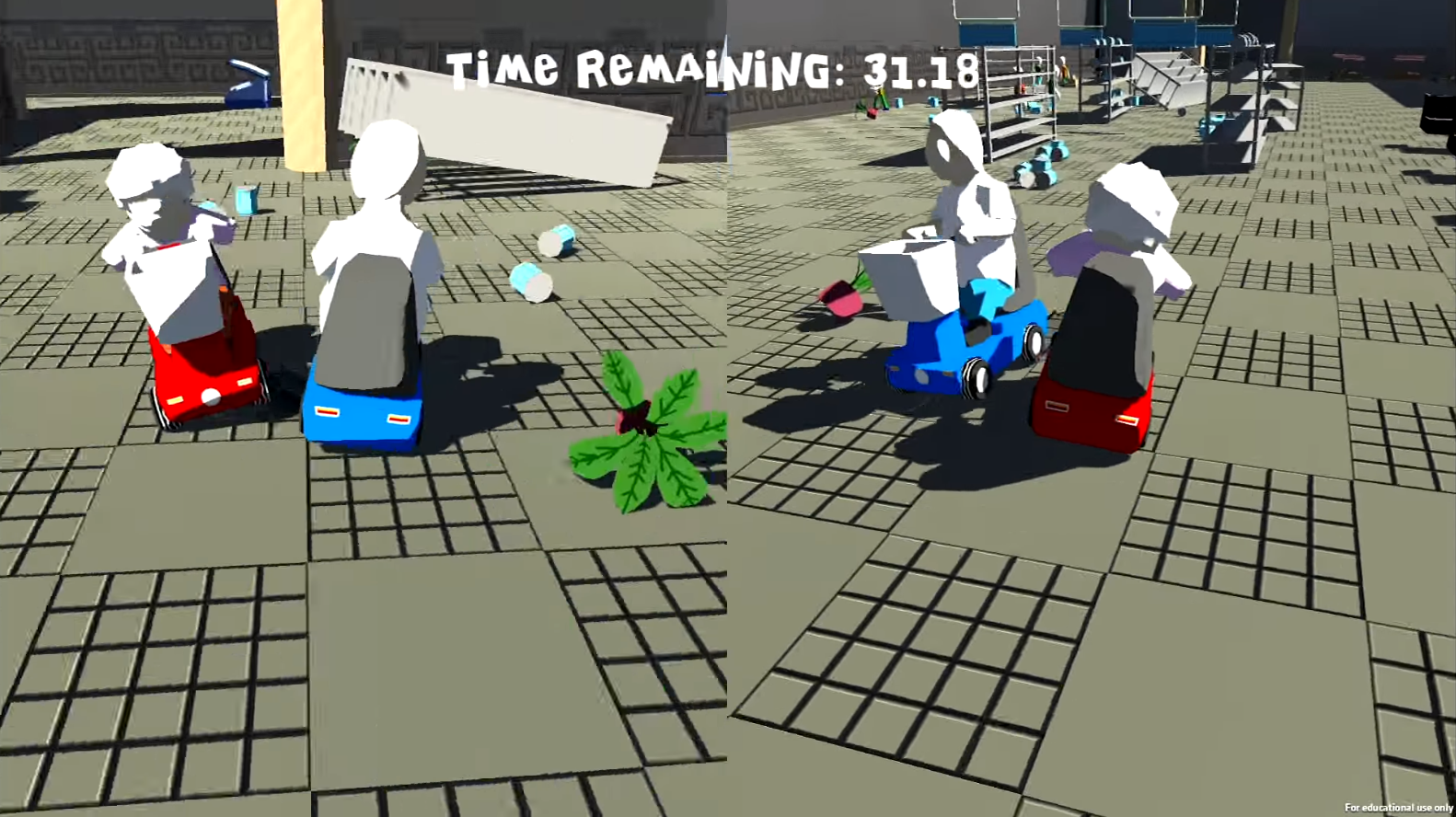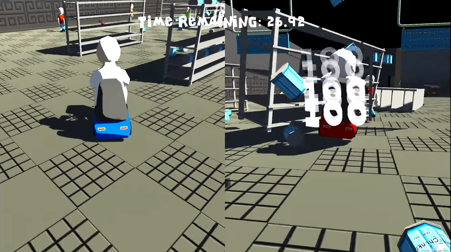 In this competitive two player game, both players have the objective to collect as much shopping as necessary within the set time limit. This is achieved by knocking over shelves and picking up the fallen shopping. Its also possible to steal the other players shopping by ramming into them at a high speed. Throughout the level there are obstacles such as larger shelves and other shoppers.