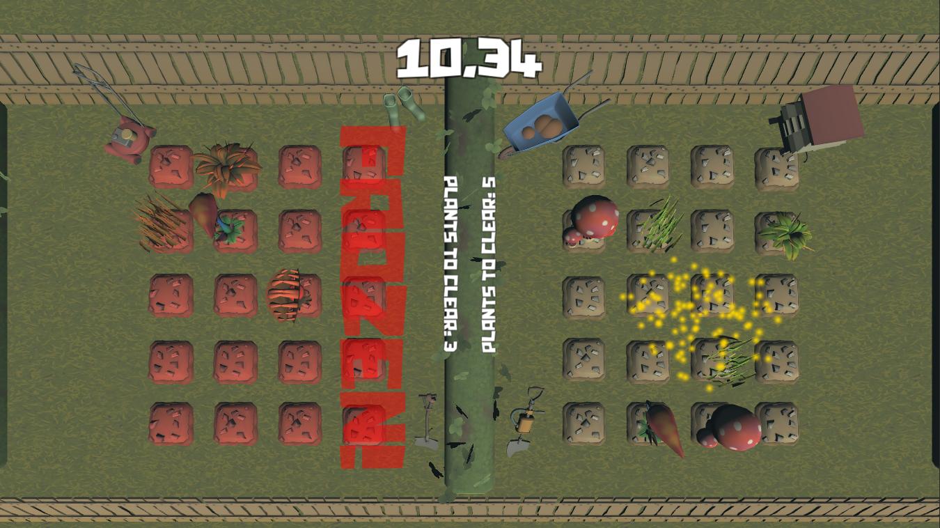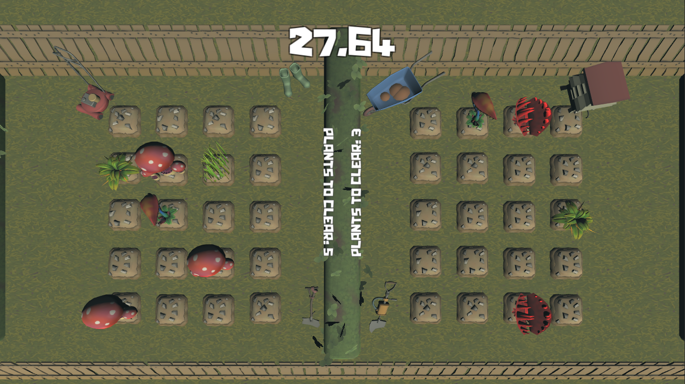 Whack-A-Weed is a very simple yet competitive two player game where each player has to remove all of the plants on their side of the screen. whoever clears their side first or has the least amount of plants when time runs out wins.